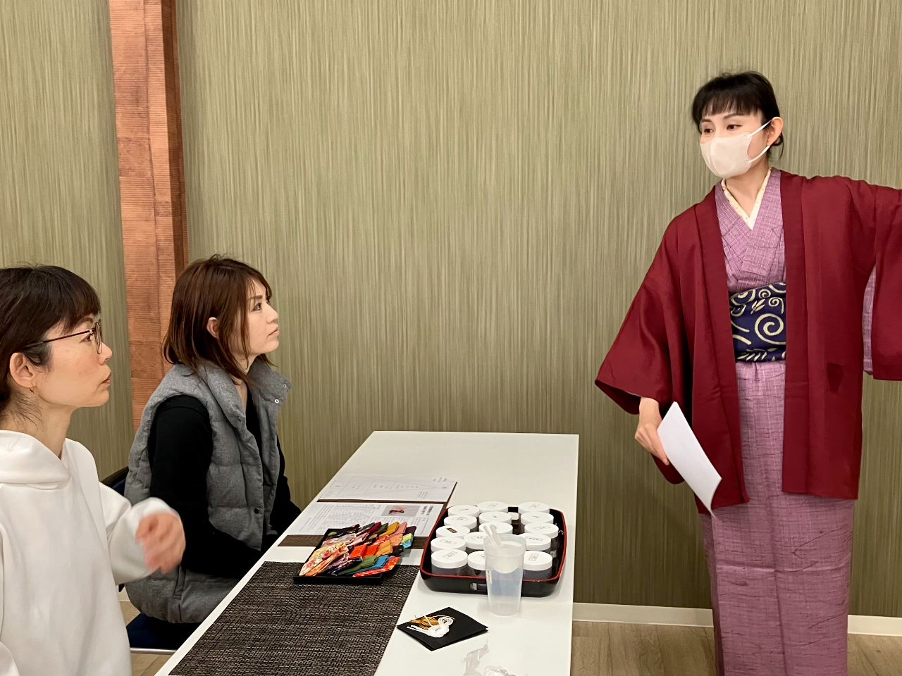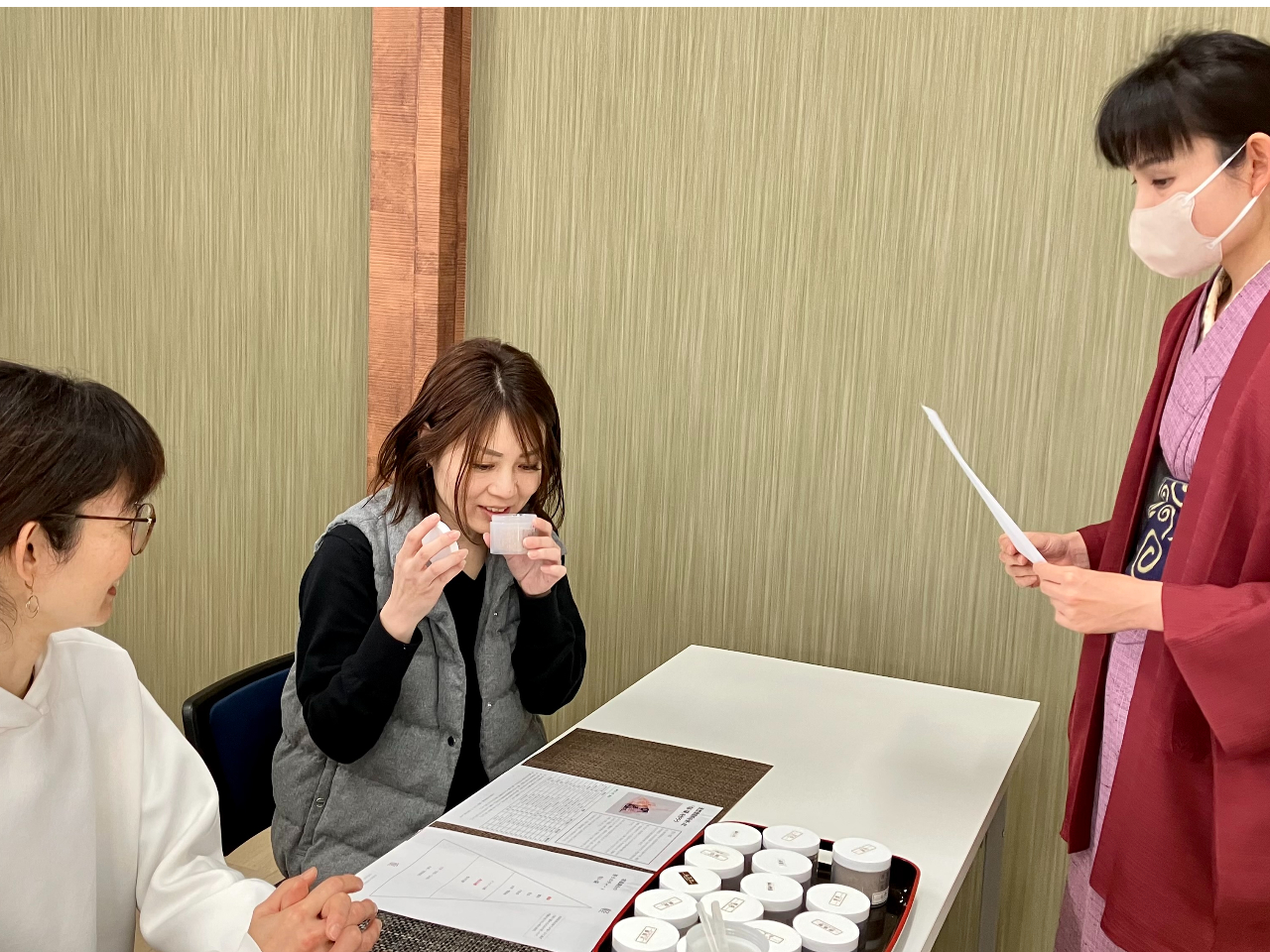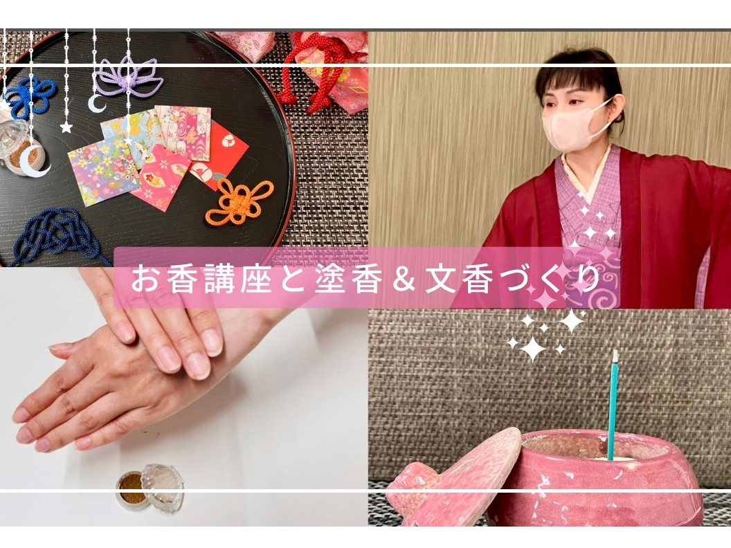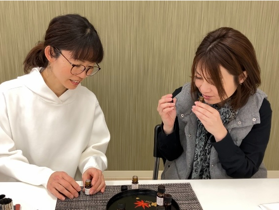 お香について楽しく学んだあとは、オリジナルの香りを作り、お香のボディーパウダー「塗香」と小さな匂い袋「文香」を作ります。