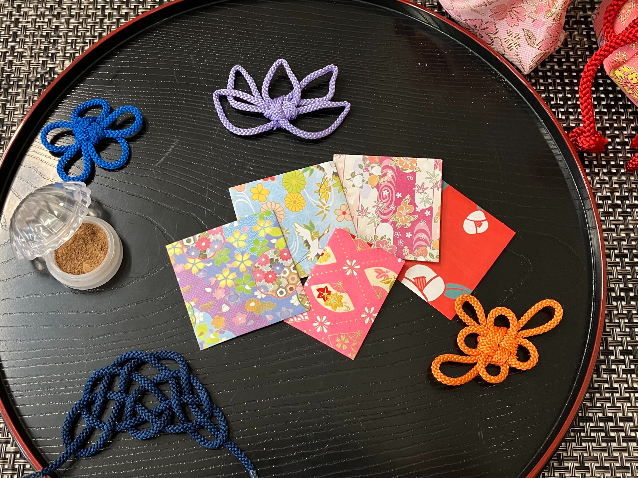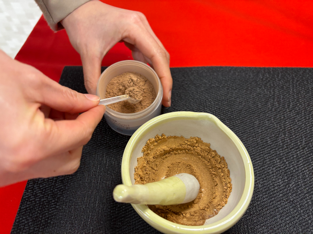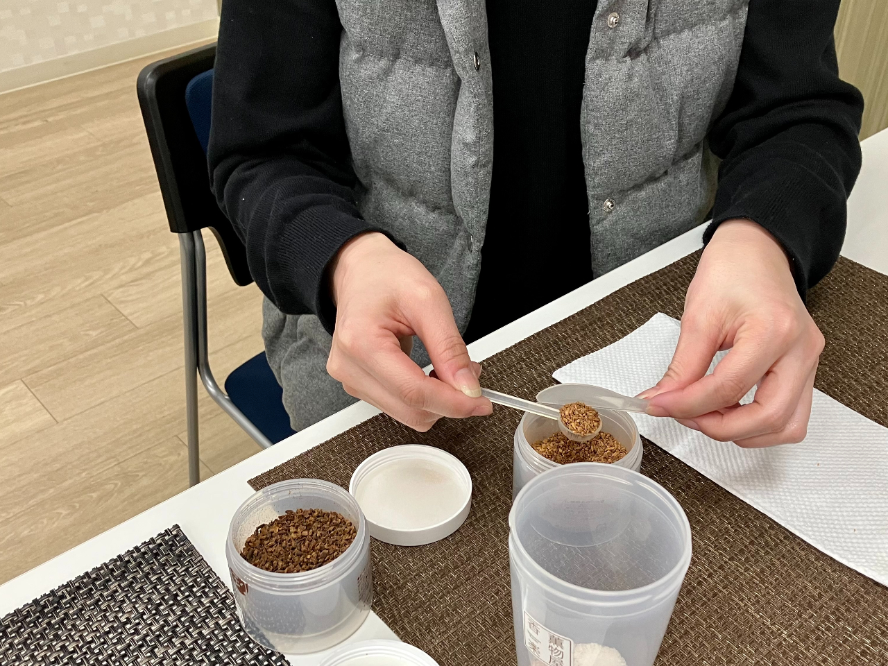 お香について楽しく学んだあとは、オリジナルの香りを作り、お香のボディーパウダー「塗香」と小さな匂い袋「文香」を作ります。