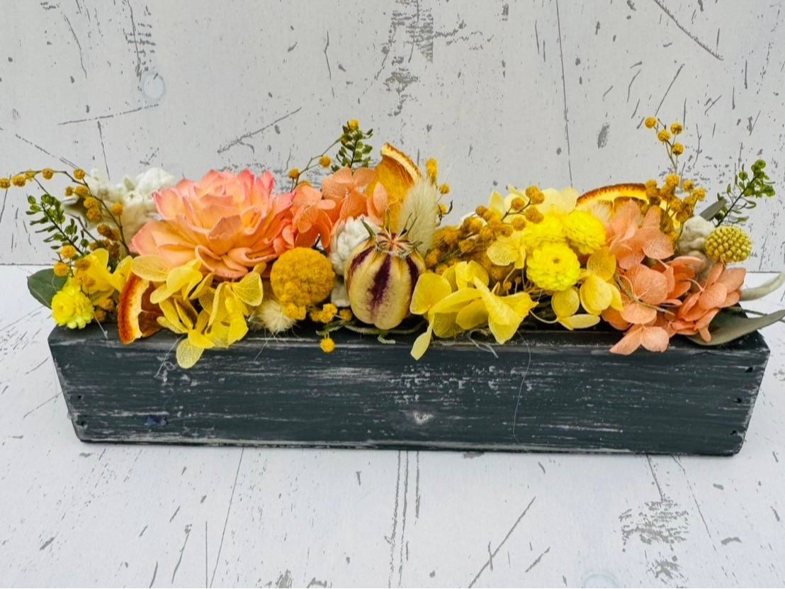 バトンのように細長いシャビーシックな木箱にお花をアレンジします。
