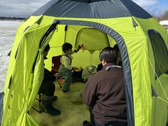 風の強い日でしたが、あらかじめ設置してあるテントの中でわかさぎ釣りしました。家族4人での参加でしたが、スタッフさんが2人ついてくれたので苦手な餌つけしてくれたり、ひくタイミングを教えてくれたりと楽しむことができました。わかさぎ120匹の他、うぐいも10匹以上つれました。わかさぎは天ぷらにしてテントの中でたべました。テントの周りは白銀の世界で自分たちのテントしかなくプライベート感たっぷりでした。お昼は地元のラーメン屋に寄りラーメンを食べました。ロイズの工場にも帰る途中に寄って朝のパンやお土産を買いました。ホテルへの送迎もあり冬の北海道を1日満喫することができました。あらかじめ帰りに寄りたいところなど希望を聞いてくれるなど、スタッフさんもとても親切でした。