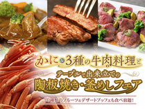 お部屋おまかせで、<【かに&3種の牛肉料理と陶板焼き・釜めしフェア】会場おまかせバイキング>が★お一人様2000円割引★