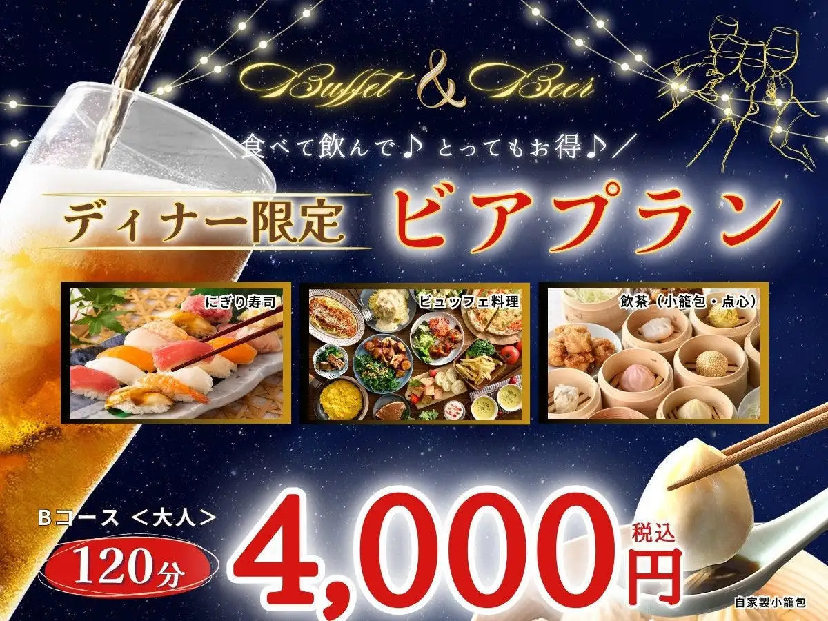◆◆熱々点心・寿司・ディナーブッフェ40種食べ放題90分+アルコール飲み放題120分【食べ飲み放題Bコース】