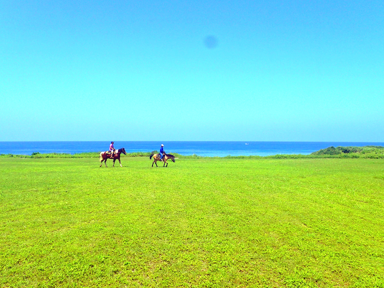 【沖縄の青い海がパッーっと広がる大パノラマ。馬の上で普段とは違う高い視点から海と空を見渡せます。】