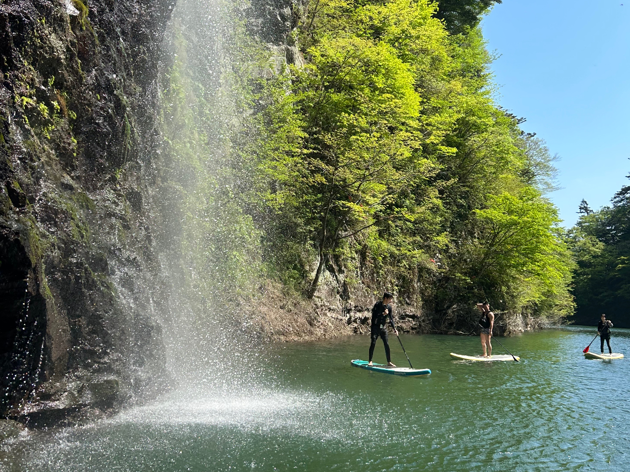 渓谷入口には落差50mの「回顧(みかえり)の滝」奥には大小様々な滝が落ち、深くそびえる岩壁など、SUPでしか入ることのできない渓谷の絶景が楽しめます。フィールドは貸切。穏やかな湖での開催なので幅広い年代でSUP初体験でも安心して楽しむ事ができます。