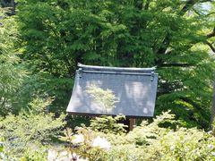 本堂の正面に立つ「夫婦桂」。新緑の枝葉をまとった姿は、とても清々しいものがありました。