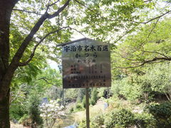 府県境でもある東海自然歩道から、桂の大木と護法善神遥拝殿を見下ろせる場所に銘板が立てられています。その表示によれば、遥拝殿の奥にそびえている桂の木は宇治市の名木百選の一つで、樹齢は500年を超し高さ27.4mにも達する巨木です。