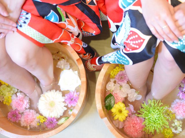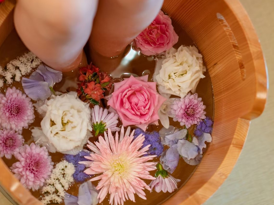 フォトジェニックな四季の草花を浮かべた癒しの足湯がセットになった