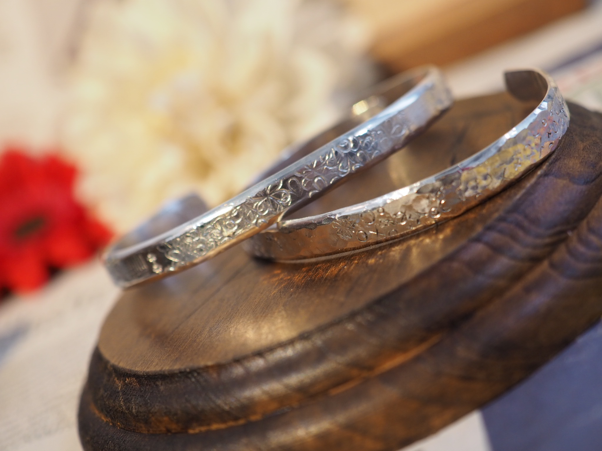 シルバーなどでペアバングルorネックレスを手作りしてみませんか。お好きな刻印とテクスチャーを打ち放題。リングとコーディネートも.