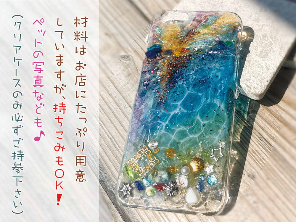 各自のスマホに合った透明プラスチックケースをご持参下さい(シリコン製は製作に不向きですのでご注意下さい)。