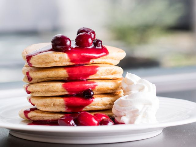 デザートには、自家製の全粒粉パンケーキに、フルーツやベリーのソースにやっぱり生クリームは外せない!ドライフルーツやはちみつをかけたりと贅沢にオリジナルパンケーキの出来あがり♪