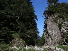 金門の下流側から峡谷を見ると大山北壁を垣間見ることができることから、御神体である大山に通じる門(禁門)としてみなされた事が名前の由来です。山岳修行者や僧兵たちが修行に励んだ場所になっていたようです。詳細情報をみる