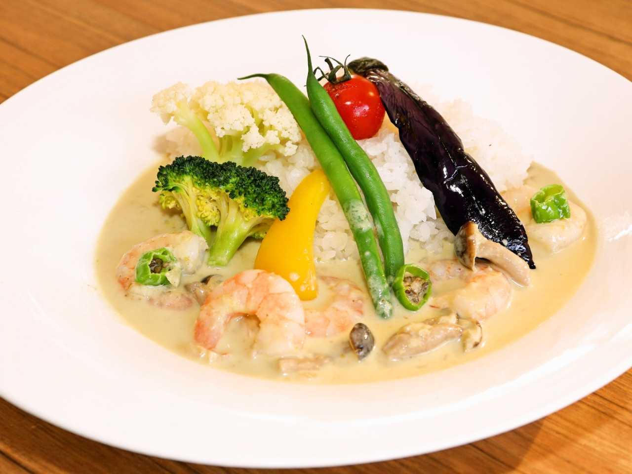 メインは今回、エスニックカレーを注文しましたが、大きなえびがたくさん入っていました。ほどよい辛さと、ココナッツミルクのまろやかさのバランスが絶妙で、最後の一口まで美味しくいただきました。また、ライスに添えられた野菜も色鮮やかで、視覚でも楽しむことができました。