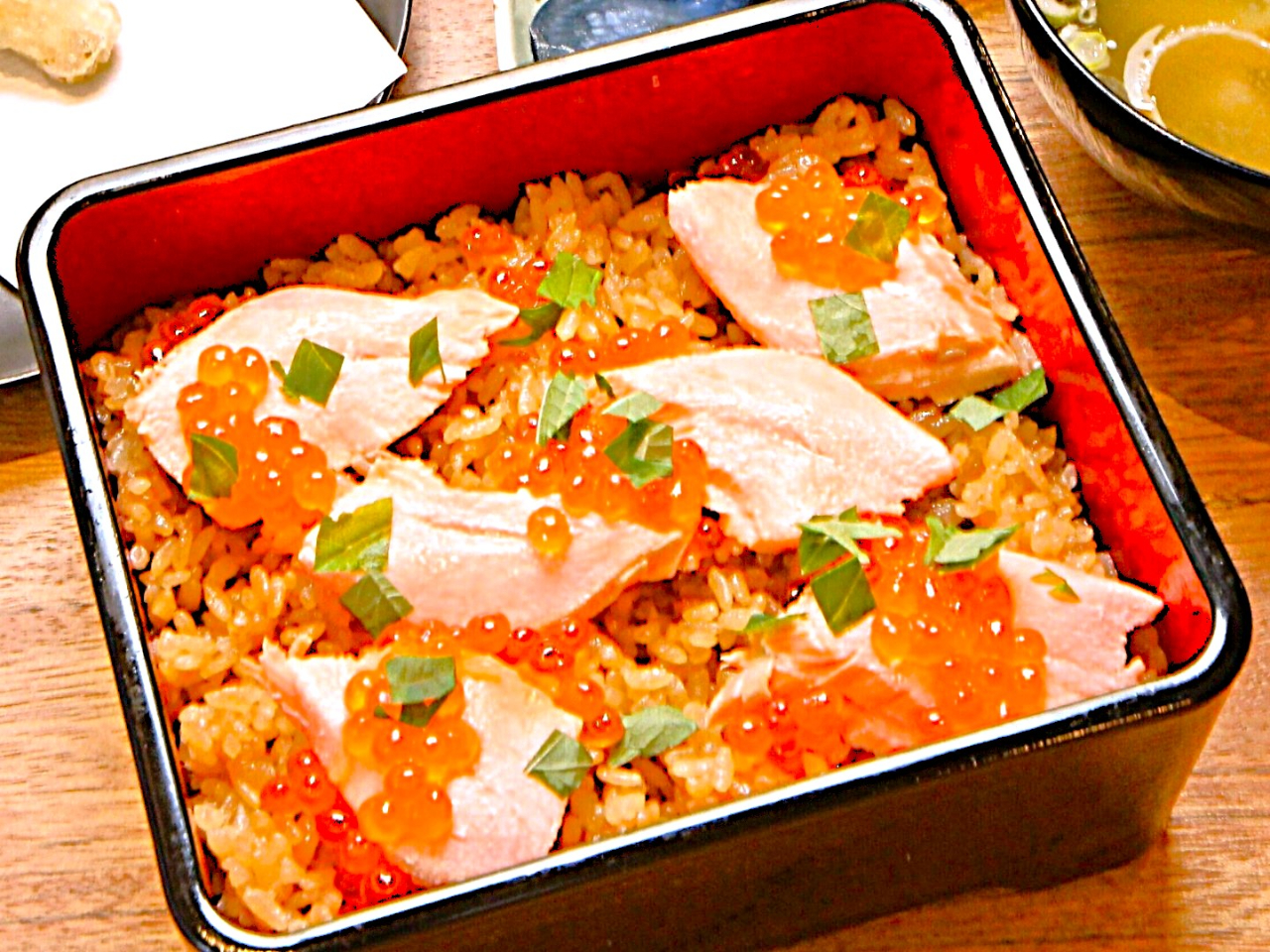 鮭のアラで炊いたご飯の上に、鮭の身とイクラをのせた宮城県亘理地方の郷土料理。