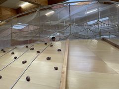 ソライは、0歳から小学6年生までが、ダイナミックなアスレチック遊具で遊べて、ものづくりも楽しめる全天候型児童遊戯施設です。「アソビバ」は、大迫力の木製バンク遊具や立体迷路のような巨大ネット遊具があり、冬場や天気の悪い日でも、思いきり体を動かせる空間です。広い空間を登ったり、転がったり、子どもたちの工夫で遊び方が何通りも広がるのが特徴です。