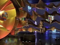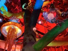 入り口にて説明を受けます。暗い中、原色でライトアップされた展示物を見ながら、階段を登ります。スマートフォン落下防止のため、あらかじめチケット売り場で、スマホカバーを有料でレンタルした人だけ、階段から上でも撮影が出来ます。