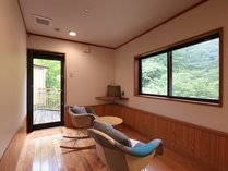 居間からは滝、壮大な荒山の景色が絶景です。お友達同士、ご家族、もちろんカップルのお客様方に静かで贅沢な休日をお過ごしいただきたく作りました。
