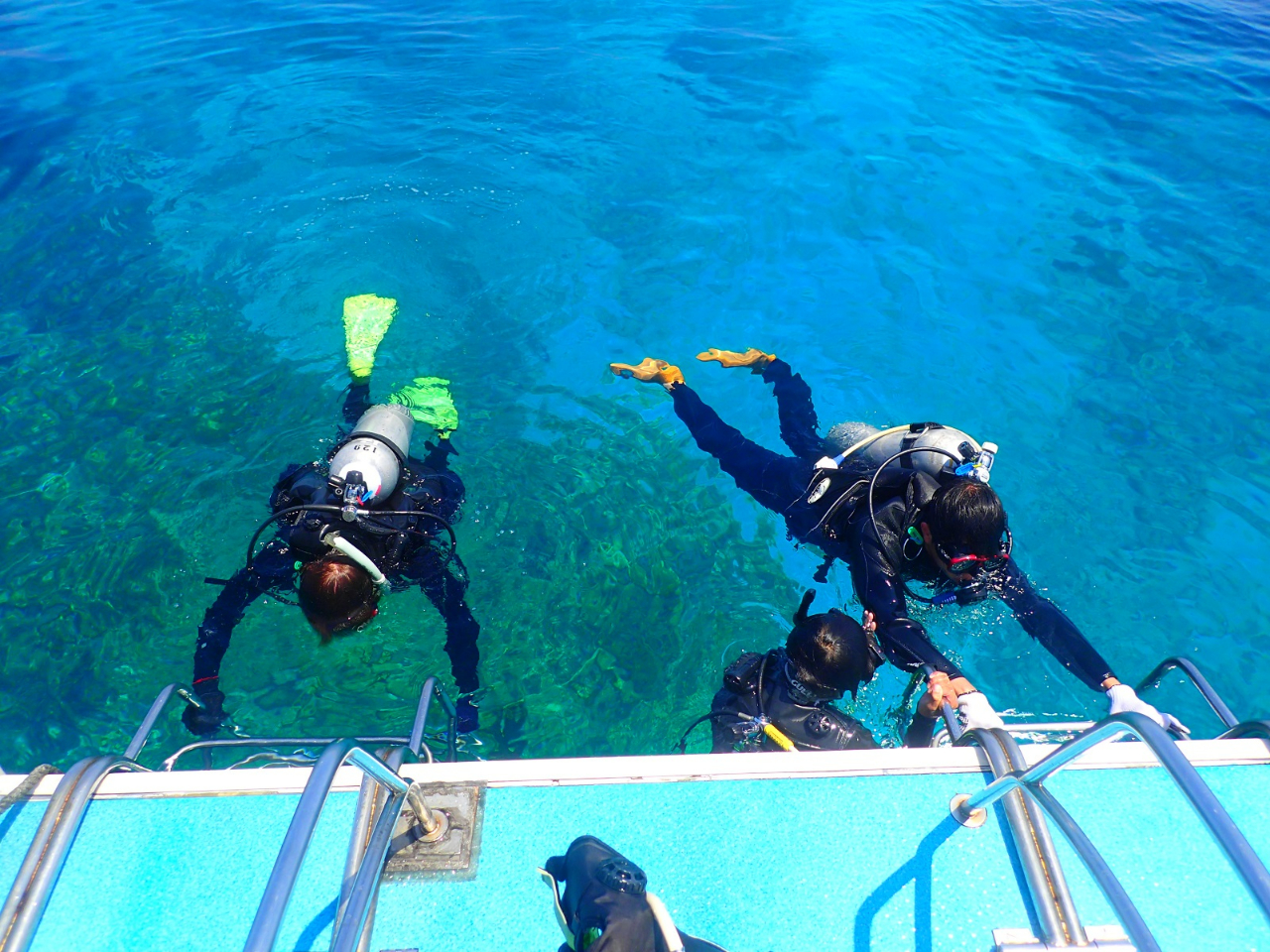 はしごにつかまって水面で呼吸の練習。いきなり深い所行かないから、徐々にステップふんでダイビング始められるよ。