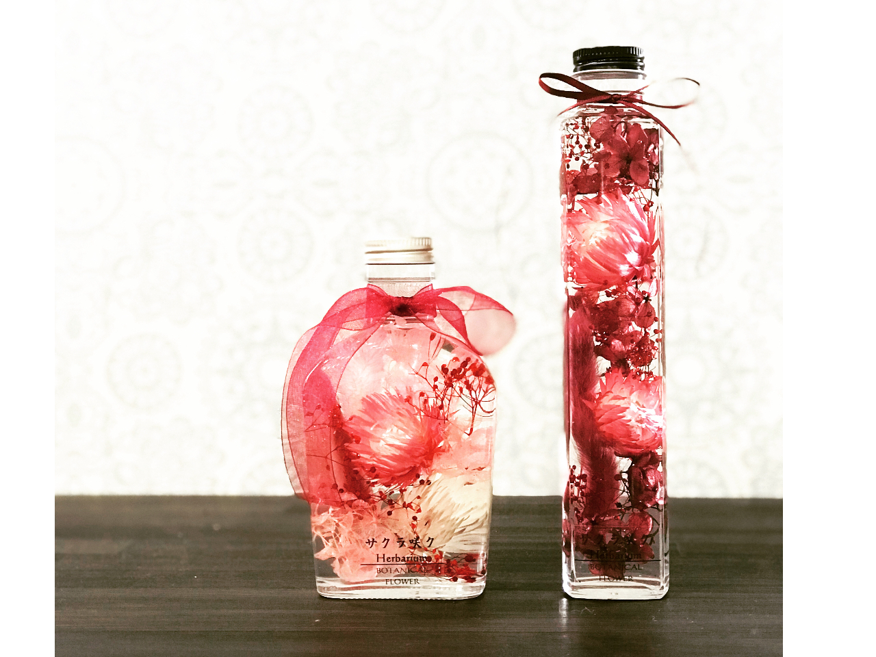 瓶の中にドライフラワー等を詰め、専用のオイルを入れて作るハーバリウムは生花よりも長く楽しむことができます。