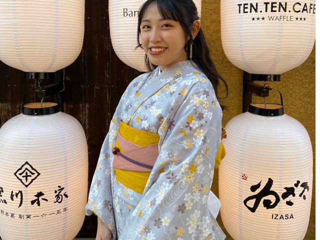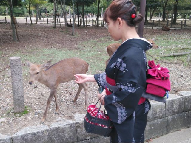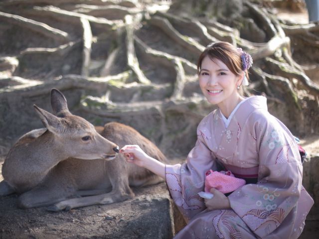 近鉄奈良駅より徒歩すぐ、奈良公園入口のレンタルショップです。カジュアルな小紋の着物に半巾帯、装飾などコーディネートを楽しんだ後、着物姿で自然豊かな奈良公園、鹿と触れあい、古都・奈良をお楽しみください。
