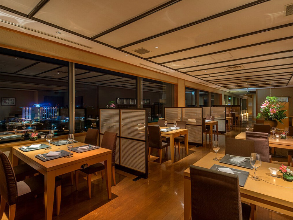 成田空港が一望できる、最上階のレストラン。ホテルの中とは思えない風情あるエントランスがお迎えいたします。大きな窓にゆったりとした空間は、お食事をゆっくりお楽しみいただくのにぴったり。