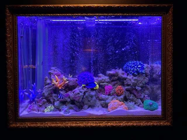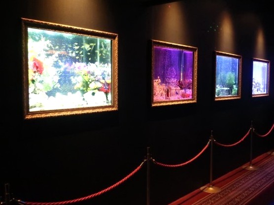 幻想的な空間に浮かび上がる色とりどりのアクアリウム