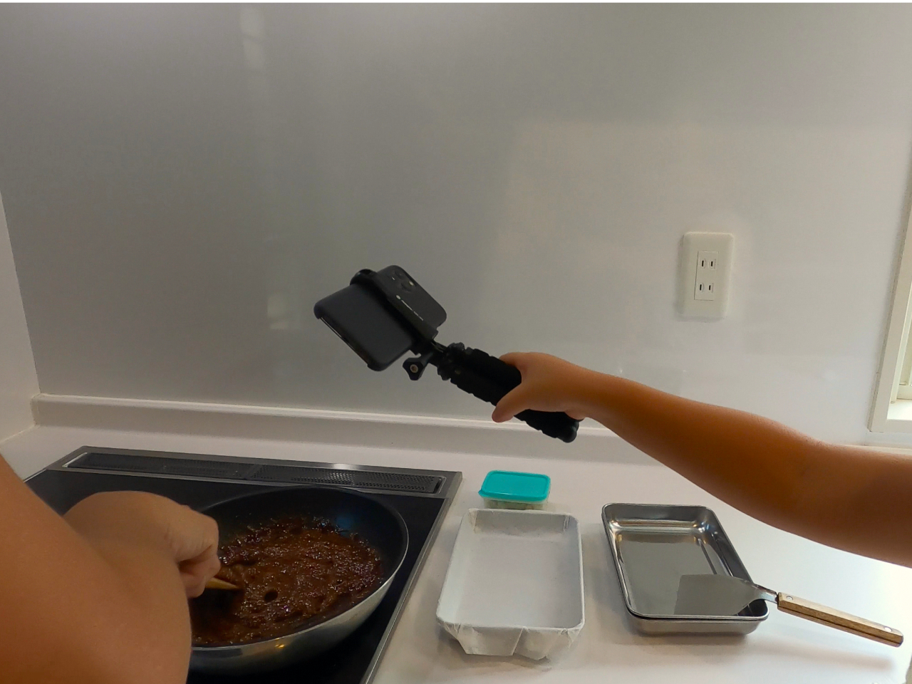 キッチンでフライパンを使った黒糖作り。アドバイスを受けながらやってみましょう♪