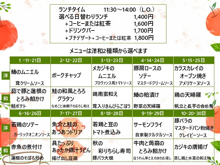 【11月の選べる日替わりランチ¥1,400】 女子会・女性同士に人気☆ファミリー・ご夫婦・カップルにもオススメ☆