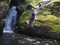 川に入ってみてだんだん笑顔になり一つ滝を滑り落ちた瞬間に
