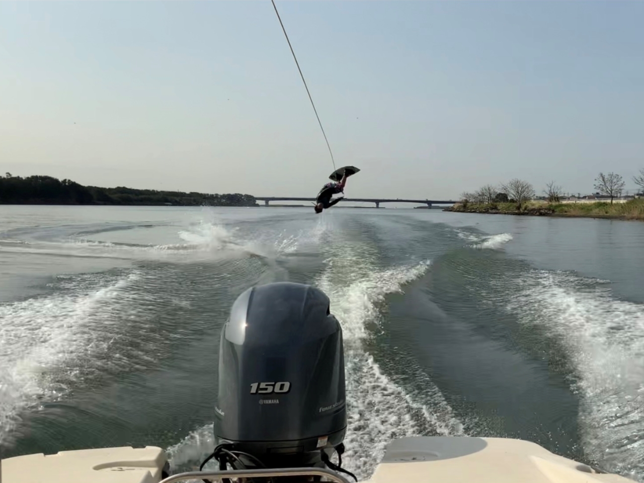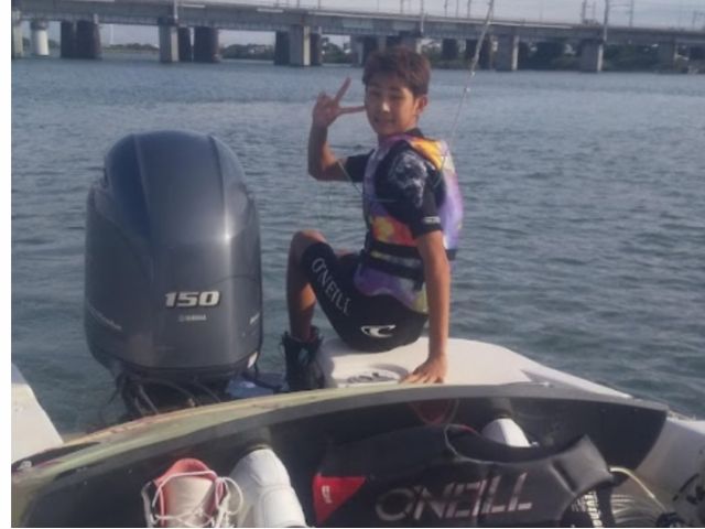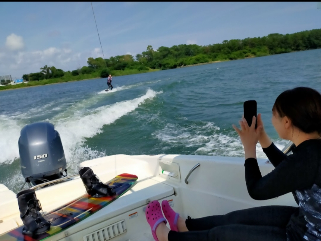 ・ウェイクボード専用の船でアドバイスしながらウェイクボード