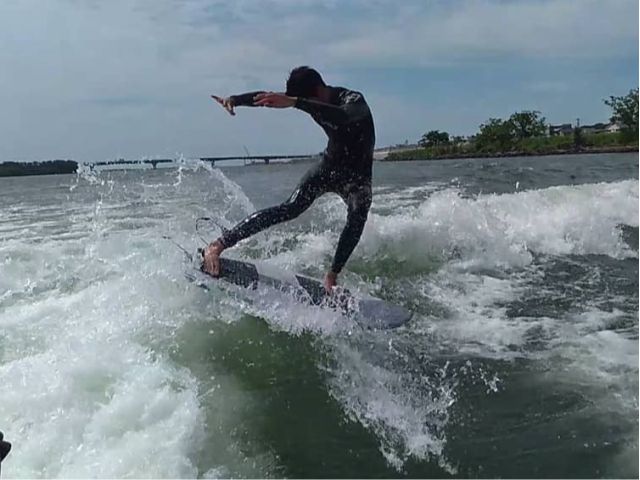 ・ウェイクサーフィン専用の船でアドバイスしながらウェイクサーフィン