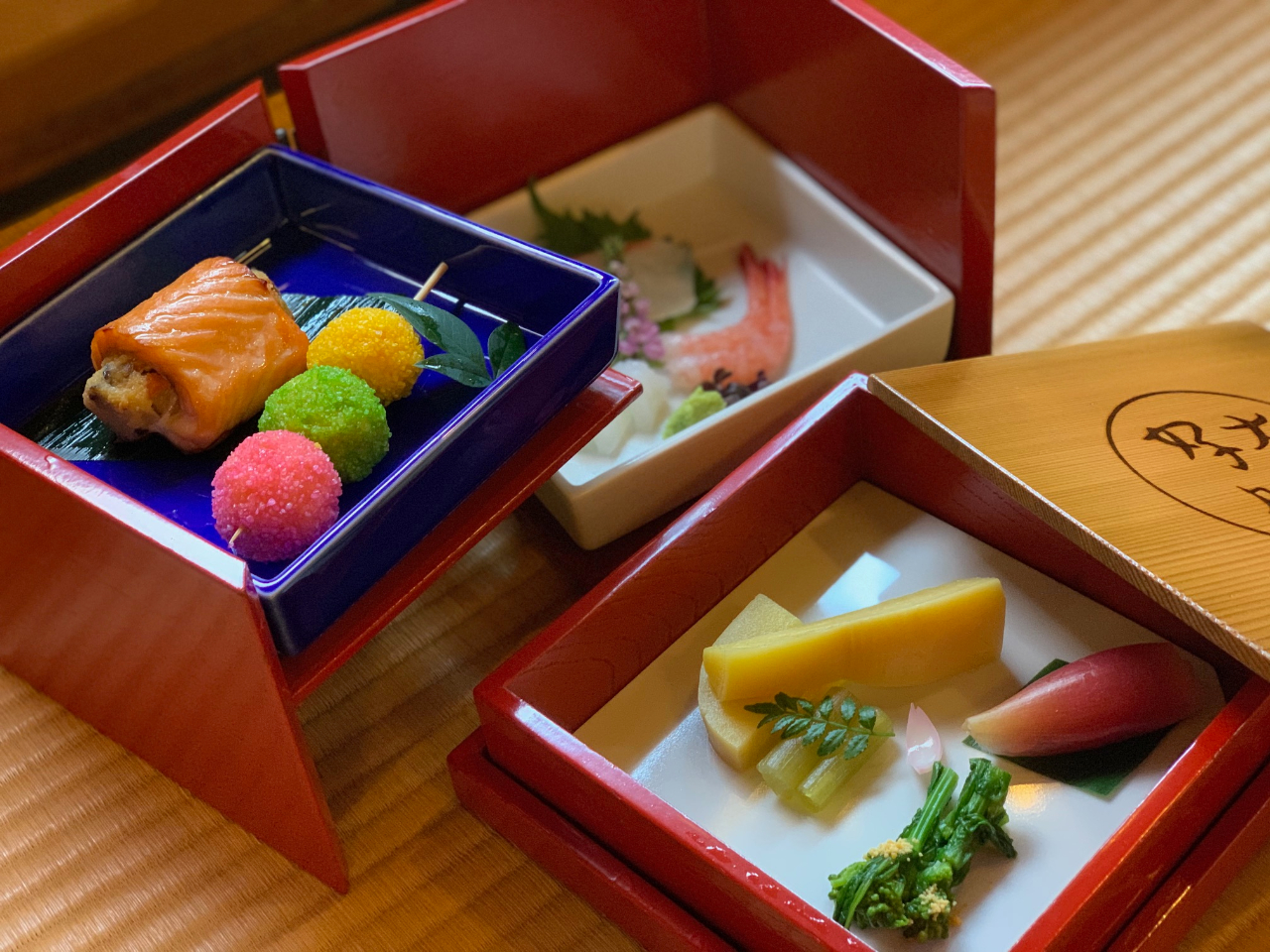 三段のお重を順に開けると、美しいお料理が広がります。