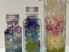 ハーバリウムに興味があって教室がないか検索したら意外と近場にあったので即申込みしました。場所が見つけられず電話すると出てきてくださってすぐに分かりました。先生はとても感じの良い親しみやすい方でポイントを押さえながらも自由に作らせてくださるスタイルでした。花材や飾りが豊富に用意してあり目移りして最初は戸惑ってしまいましたが徐々にコツを掴めました。楽しくて夢中になって作れたので2本コースにして正解でした。時間が少し余ったので追加で1本作らせてもらいました。3本作ってやっと慣れてきたかなという感じだったので是非また作りに行きたいです。