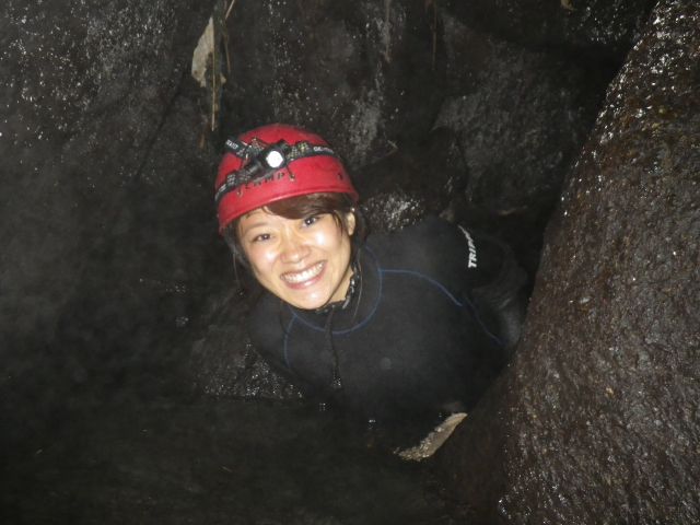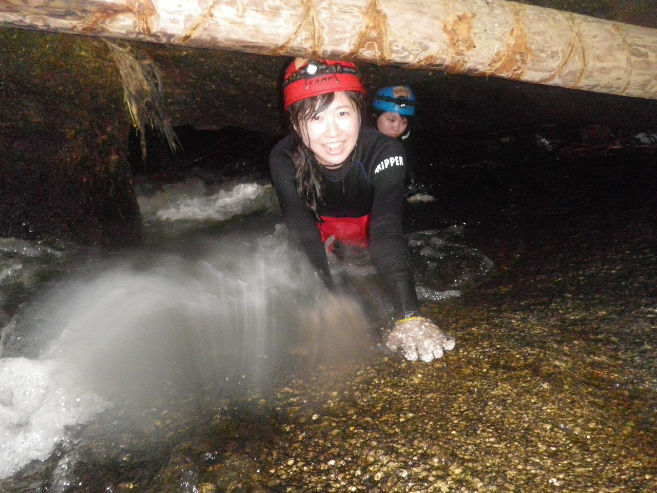 身体だけでなく、五感も使っての暗闇の沢登り。狭い岩のトンネルをホフク前進で抜けるコースは醍醐味の一つです。