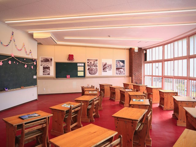 子供たちの元気な足音が響いた螺旋階段や、先生の声に真剣に耳を傾けた扇型の教室など、現在では見ることのできない貴重な姿を残しています。