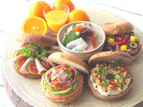 旬の魚介を使った海鮮丼や新鮮野菜とハムやサーモンを挟んだ焼き立てのベーグルサンドなどをメインとした和洋朝食ブッフェをご用意。