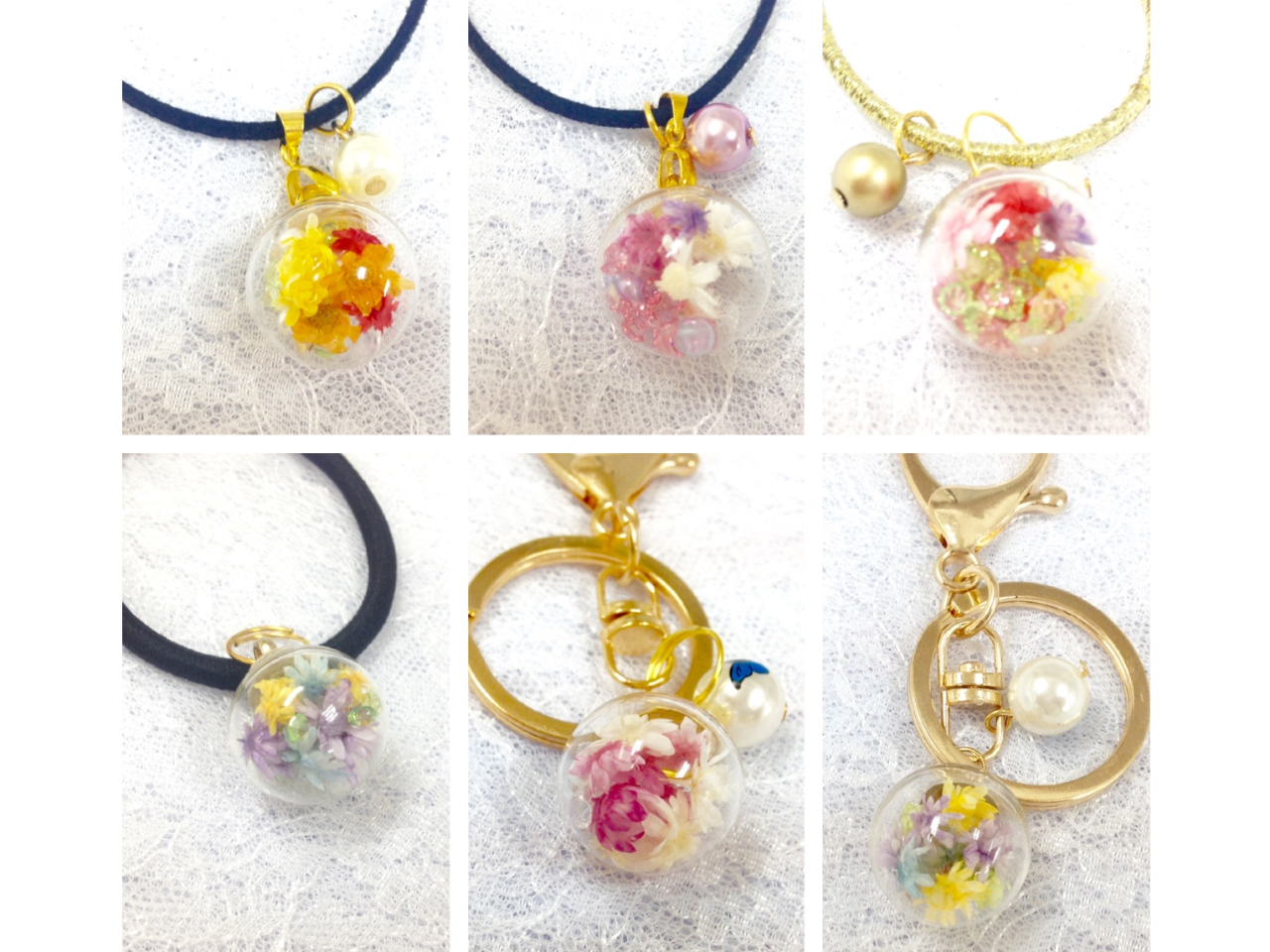 ガラスドームにお花やパール、ホログラム等を入れてキラキラ透明アクセサリーを作りましょう♪