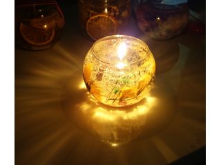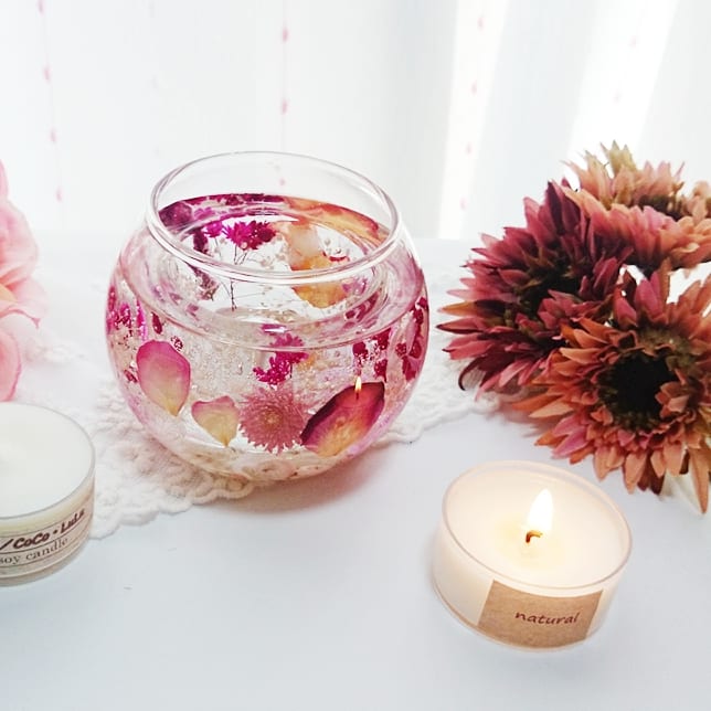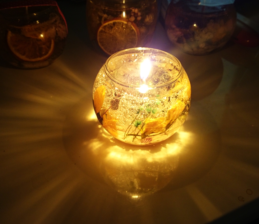 ・何度も使える!【ボタニカルジェルキャンドルホルダー丸】お風呂上がりにリラックス♪ 当日形の変更可能。ティーライトキャンドル付 〜女性 カップル ファミリー 夏休み制作 プレゼント等に