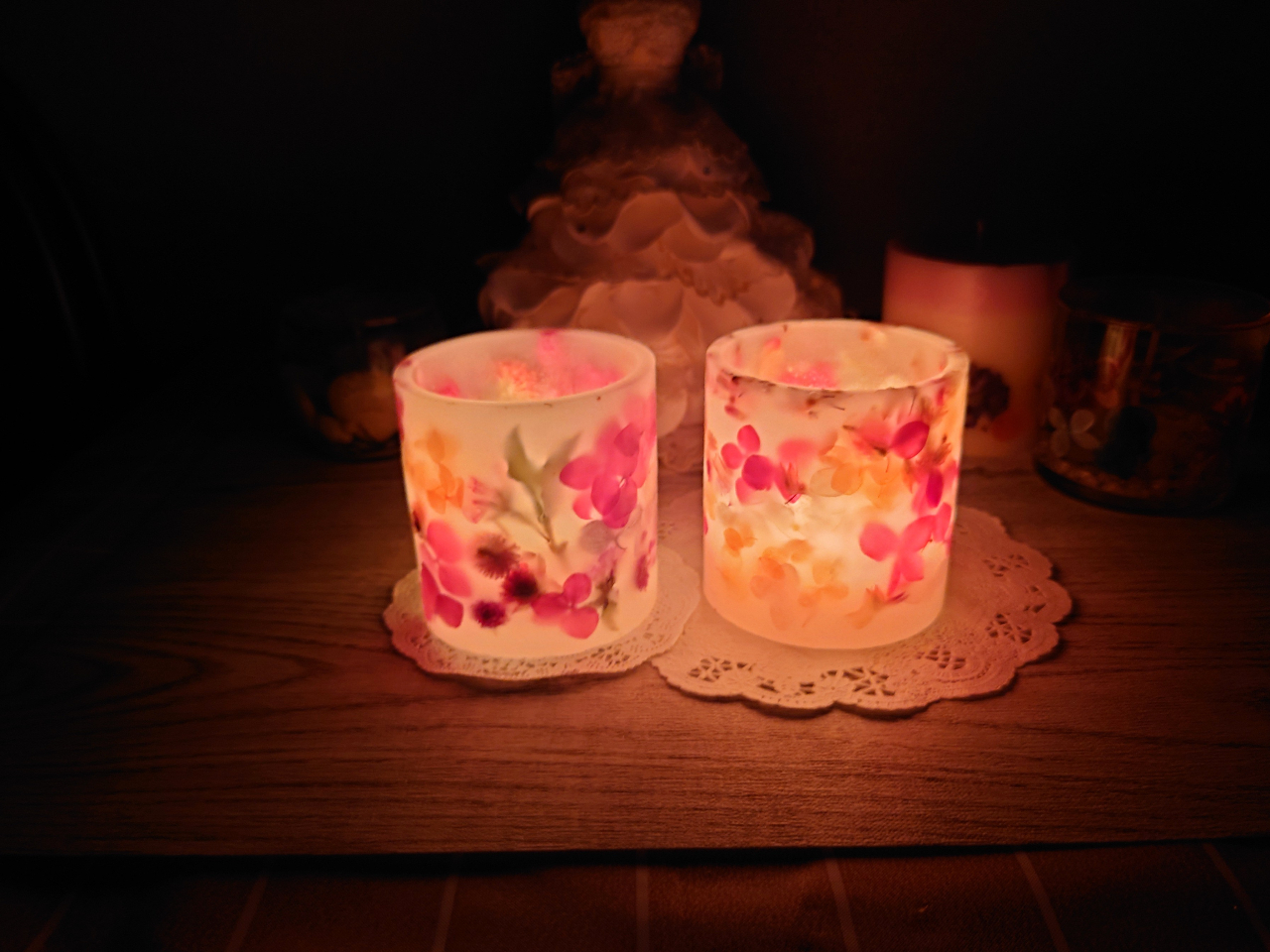 押し花やあじさいが可愛い♪飾っても火を灯しても素敵です。