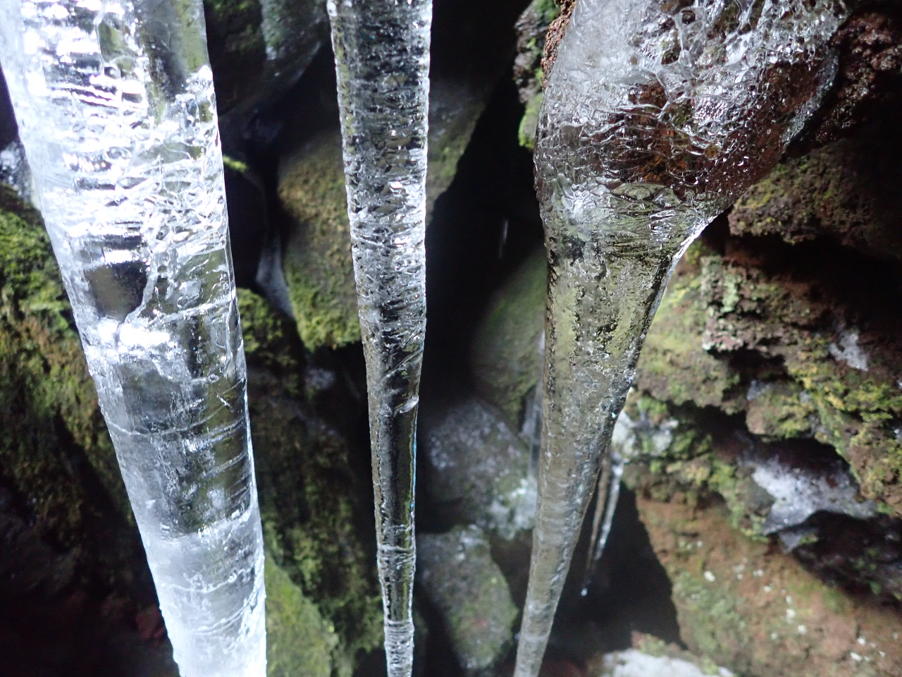 洞窟や火口では美しい氷にも出会える。かも知れない。
