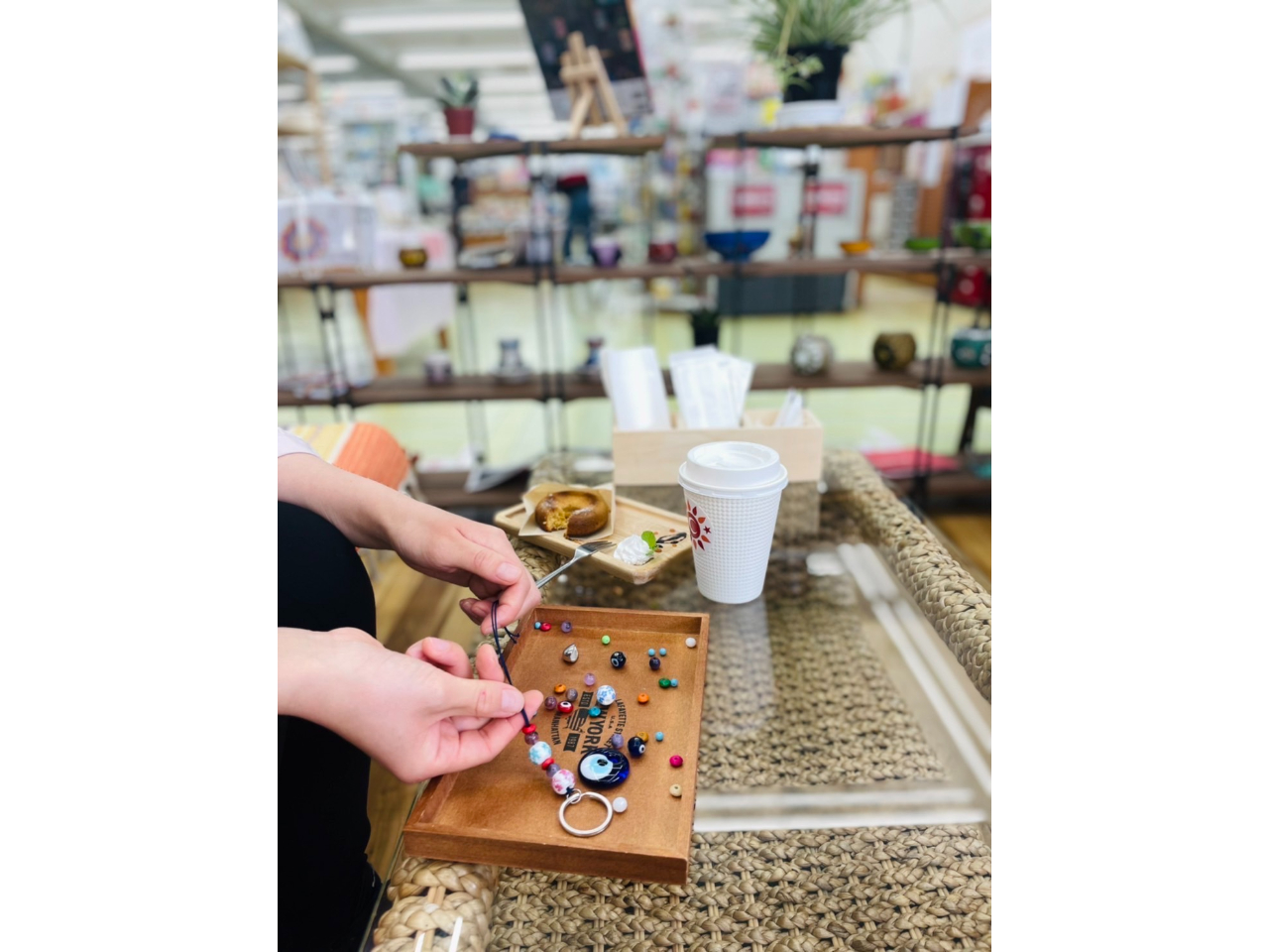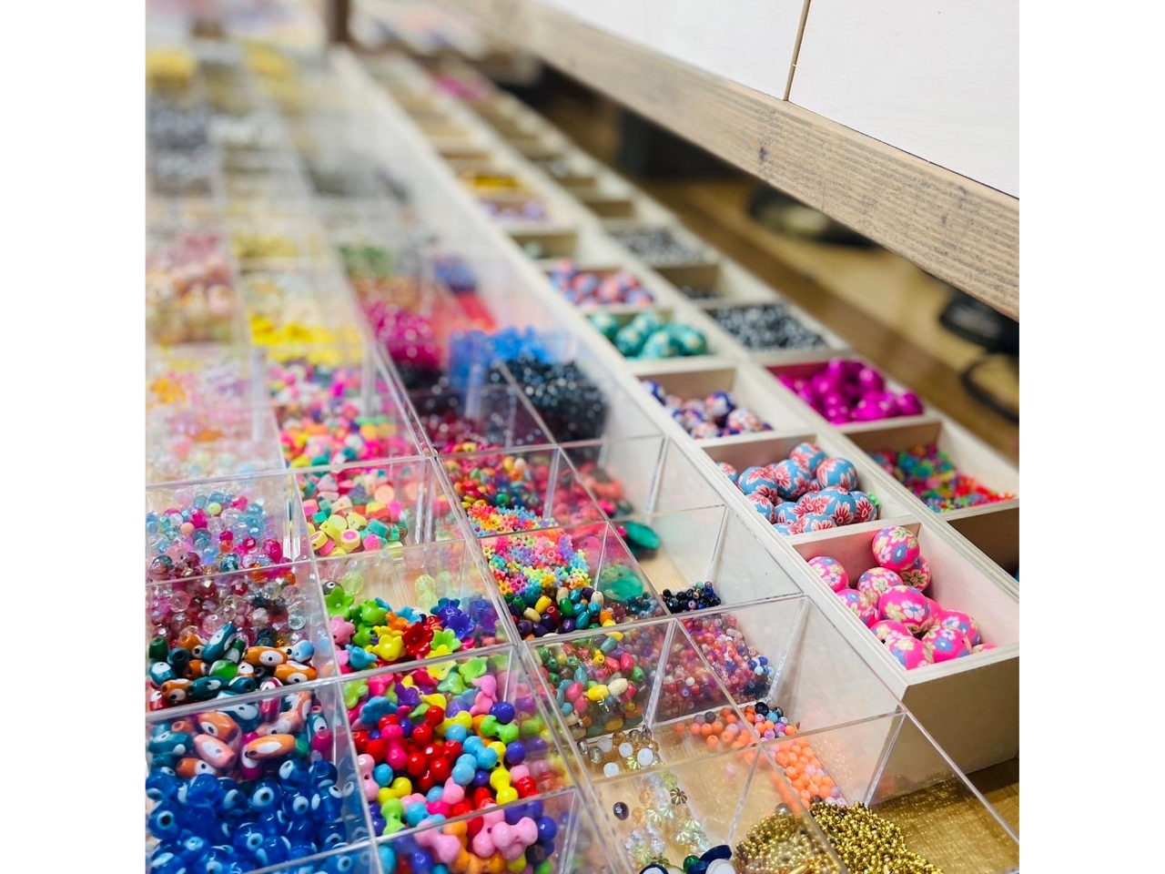 数十種類のビーズを組み合わせて、世界に一つだけのお守り付きキーホルダーやブレスレットを作る事が出来ます♪