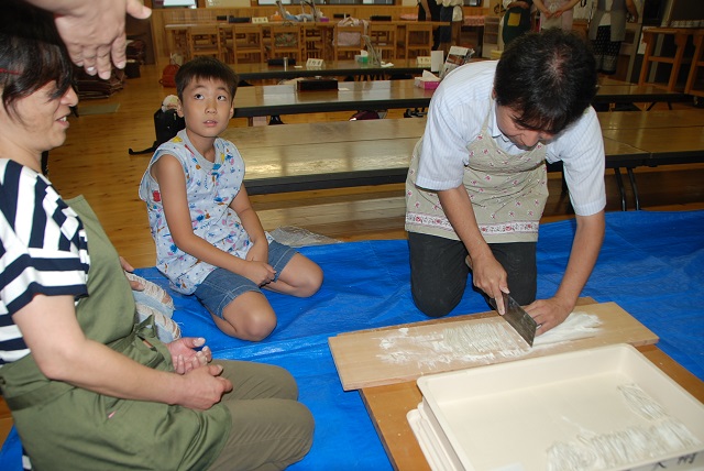 そば打ちを教えて下さるお母さんも孫を見るように優しく褒めて接して下さる一方で、子供達だけでの作業では足りない所はちゃんと補って対応してくれました。
