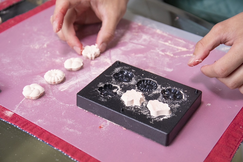 └和三盆糖をふるいにかけ、型にはめて、型抜きして、という工程をご体験いただけます。