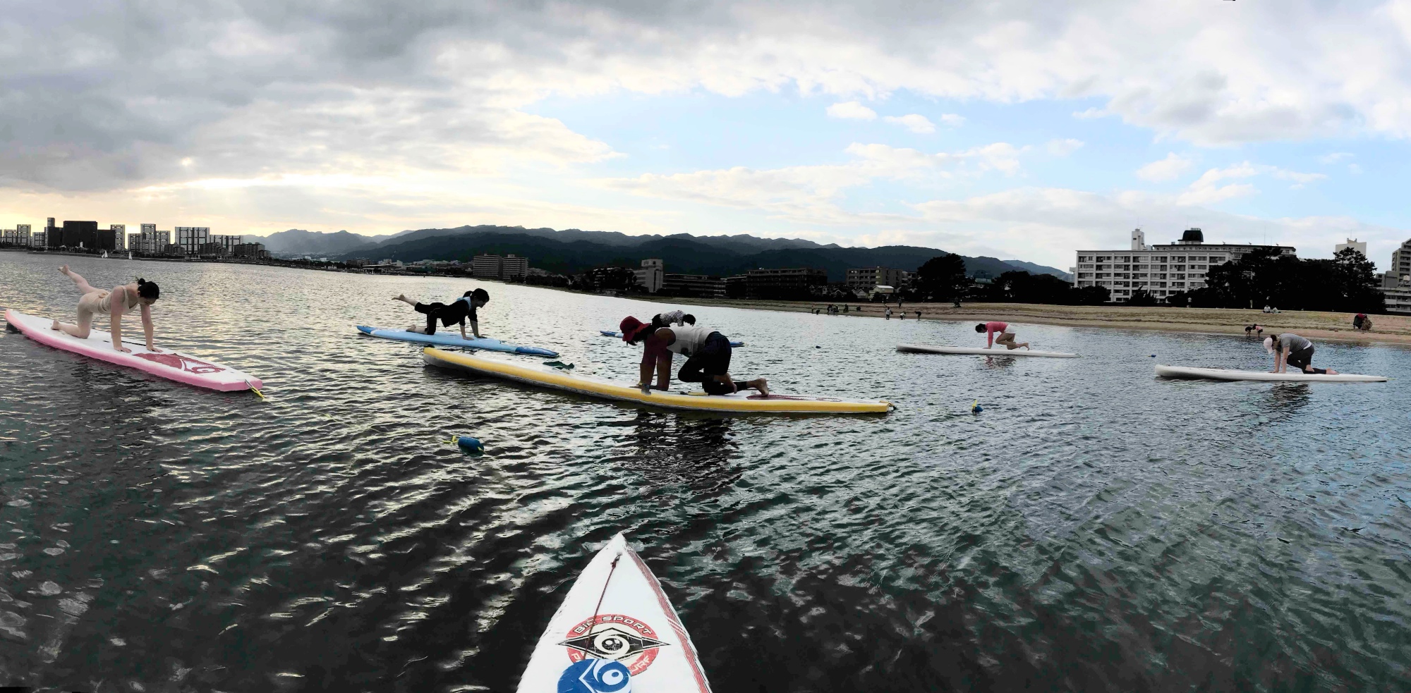 開始時間30分前に当ショップにて受付していただき、サップの乗り方やオールの使い方、簡単なヨガのポーズの説明をさせていただきます。