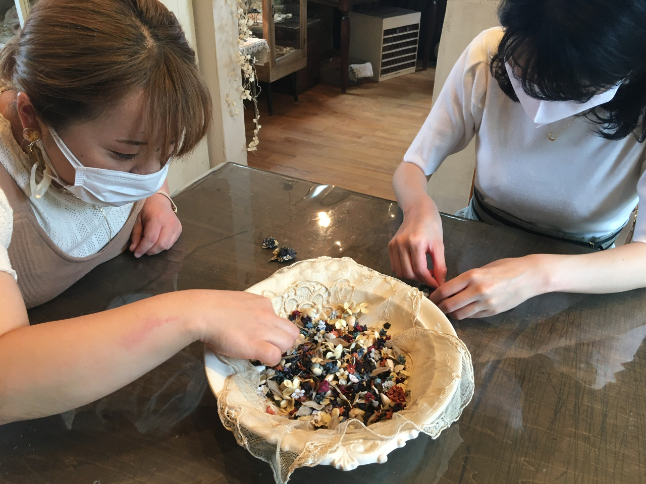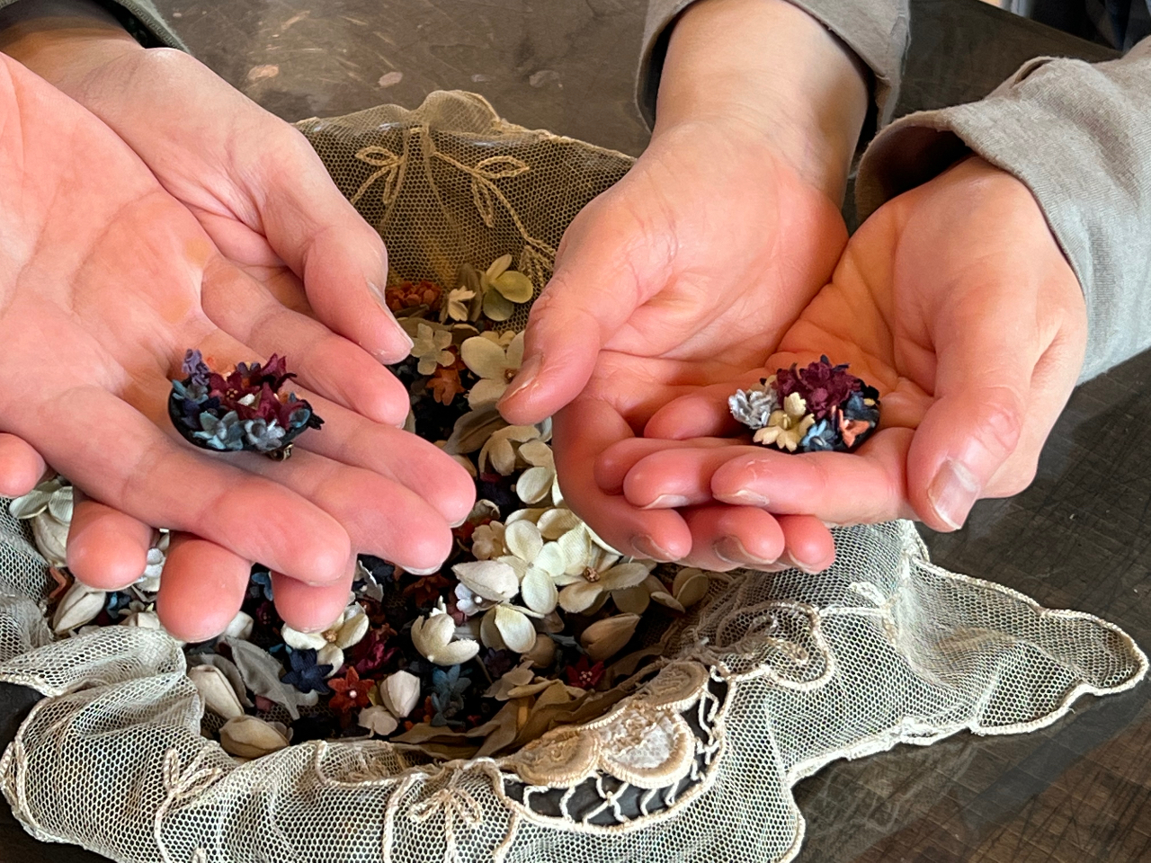 完成した色とりどりの染め花を使ってブローチ、コサージュなどのアンティーク風なアクセサリーを制作していきます♪丁寧な指導で初心者でも安心です。
