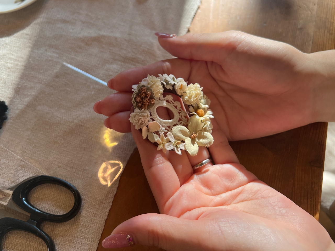 完成されたお花を土台にのせていきブローチなどのアクセサリーを制作します。