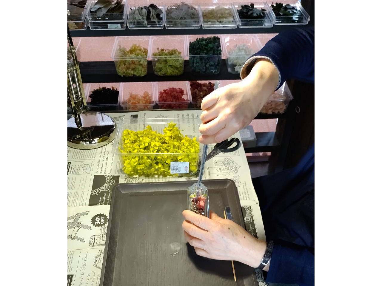 好きな素材をデザインを考えながら選び、瓶につめていきます。