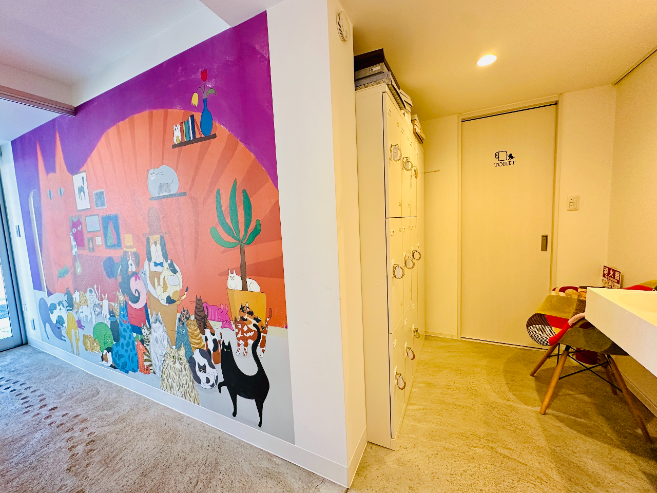 B猫たちのいたずらや誤飲をはじめとする事故防止のため、ロッカーに上着やお手荷物をお預けいただきます。
