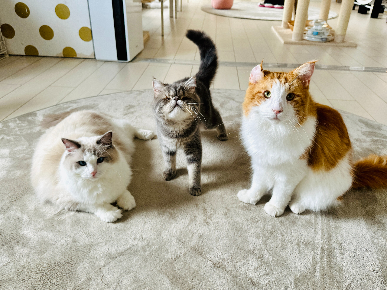 みんな「元」保護猫たち。いとこんは目が見えませんが、元気いっぱい!(左)おもち/ラグドール(中)いとこん/エキゾチックショートヘア(右)おあげ/メインクーン
