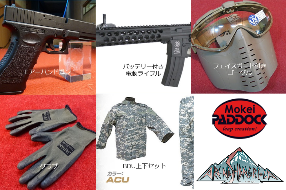 必要なアイテム(銃本体・ゴーグル・戦闘服・グローブ)はお持ちでない方には無料レンタル致します。