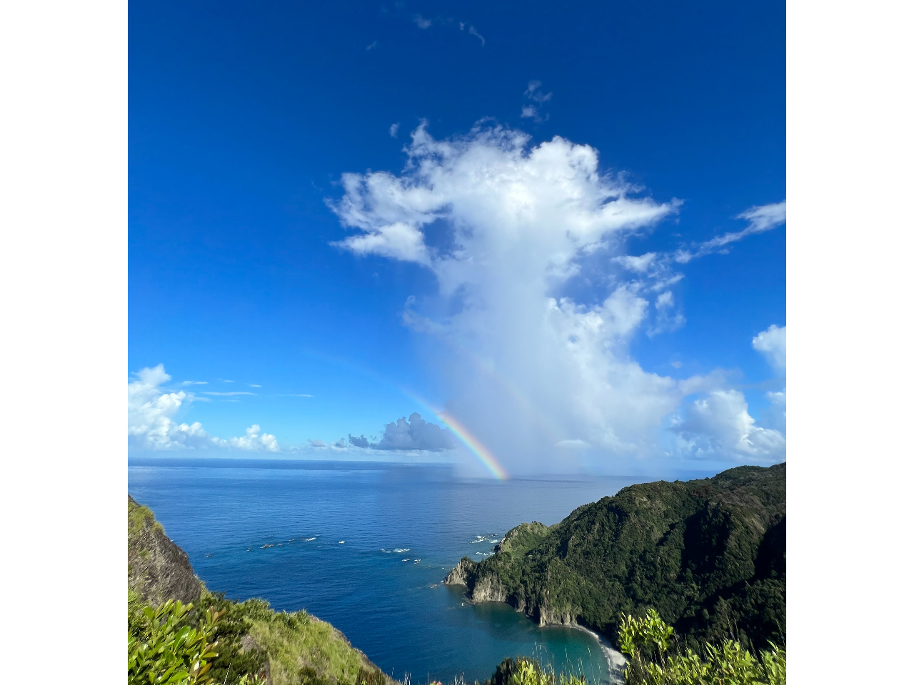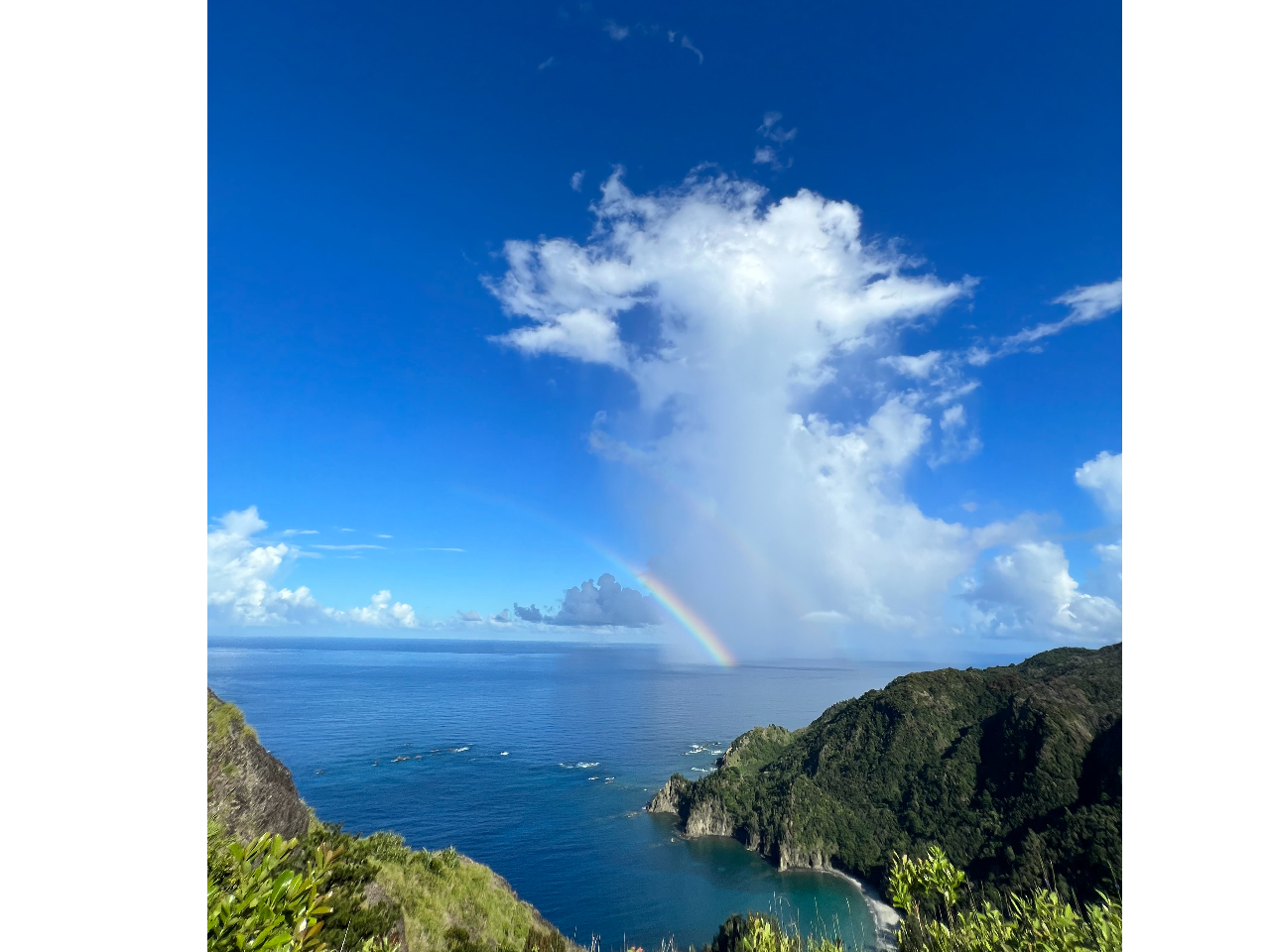 250mの断崖!まぶしい青空に映える赤土!海を渡る雲の影!水平線には母島が望める事も!トレッキング・登山